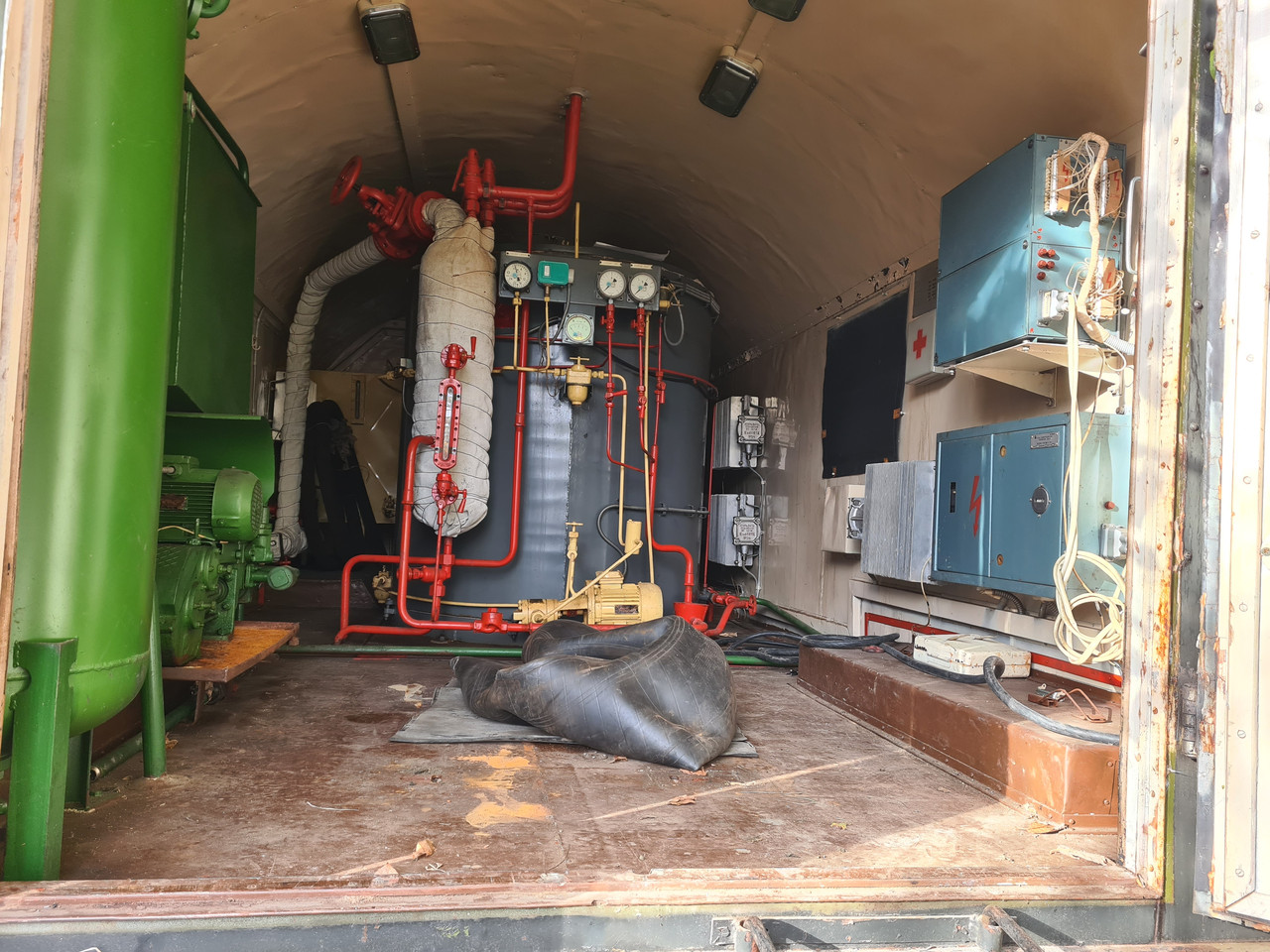 Передвижной паровой котел ППК-1600 новый, с хранения. ППК-1600 является прямоточным котлом со спиральными змеевиками. Котлоагрегат исполнен для работы на дизельном топливе. Установка котлоагрегата в отапливаемом фургоне типа, что позволяет использовать его в полевых условиях при температуре окружающей среды -40 ÷ +50 град.С. Предназначен для выработки насыщенного пара давлением до 8 кгс/см2, для широкого спектра применения: на складах горючего для подогрева вязких нефтепродуктов при приеме из железнодорожных цистерн и выдачи потребителям в полевых условиях (масел, мазута в резервуарах с помощью грелок или стационарных подогревателей), при зачистке (пропарке) резервуаров и тары, удаления лакокрасочных покрытий, жировых образований и др. загрязнений, прогрева нуждающихся котельных агрегатов и парового обеспечения, других нужд. Оборудование парового котла размещается в отапливаемом кузов-фургоне, смонтированном на двухосном автомобильном прицепе.